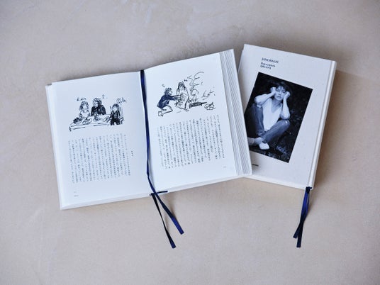 表紙はナチュラルな生成り素材を用いたクロス装に、タイトルを深い紺色の箔押し、同系色のスピン(紐しおり)が2本つく、昨今稀にみる瀟洒な体裁。そして、本2冊と各特典が収まる特製函は、繰り返しの開閉に適した丸タックと呼ばれる留め具があしらわれ、モノとしての存在感、シックな雰囲気を添えます。