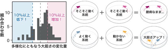 ただし、大胆さがむしろ低下する組み合わせも発見されました。そこで、組み合わせと大胆さの向上の関係を調べたところ、組み合わせた系統間の活動量に差があるほど、行動が大胆になることがわかりました。個体が互いに影響を与え合って行動を変化させる現象は「社会的促進」と呼ばれます。社会的促進による大胆さの向上は、ハエが空間内を満遍なく探索し、効率的に餌などの資源を発見することにつながると期待されます。本研究は、種内の行動多様性が社会的促進を生み出すことを実証した貴重な研究例となりました。