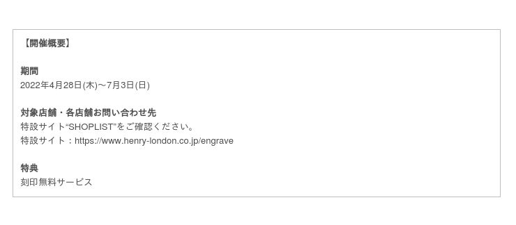 期間中に「ヘンリーロンドン」をご購入いただいたお客様には、ブランドで人気沸騰中の裏ぶた刻印サービスを通常3,300円(税込)のところを無料で承ります。メッセージを最大60文字まで刻むことが出来る「ヘンリーロンドン」の裏ぶた刻印サービスは、ご自身へのご褒美としてはもちろん、心に残るメッセージを添えて、大切な方へ贈るギフトとしても最適です。