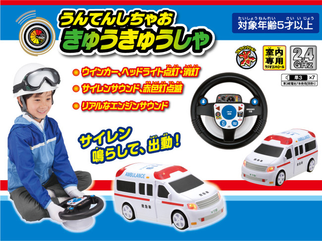 人気のロングラン商品「R/C うんてんしちゃお パトロールカー」「R/C うんてんしちゃお しょうぼうしゃ」に続くシリーズ第3弾商品です。ハンドル型コントローラーで救急車を操縦しよう!ライト、ウインカー、クラクション、サイレンなどのライト&サウンド機能搭載で、本物のような運転遊びが楽しめます。