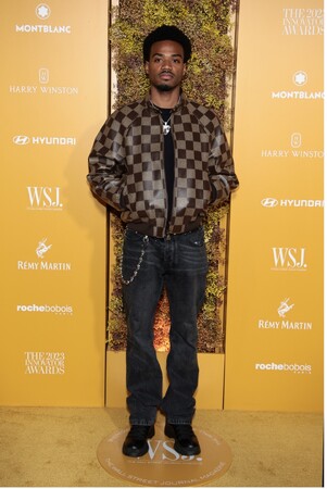 タイショーン・ジョーンズは、2024年春夏コレクションのブラウンのダミエ・レザージャケットを着用しました。