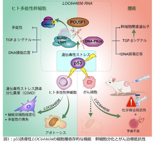 千葉大学大学院医学研究院の田中知明教授らの研究グループは、がん抑制遺伝子p53(注1)によって発現が誘導される長鎖ノンコーディングRNA(lncRNA)(注2)「LOC644656」が、DNA損傷などのストレス応答時に幹細胞の分化を促進することを発見しました。さらに、LOC644656の誘導によってがん細胞の化学療法に対する抵抗性が高まるメカニズムを解明しました。この成果は、幹細胞がDNAの損傷にどう対処するかを解き明かすと同時に、がん細胞の治療抵抗性を克服する新たな治療法開発につながる可能性があります。