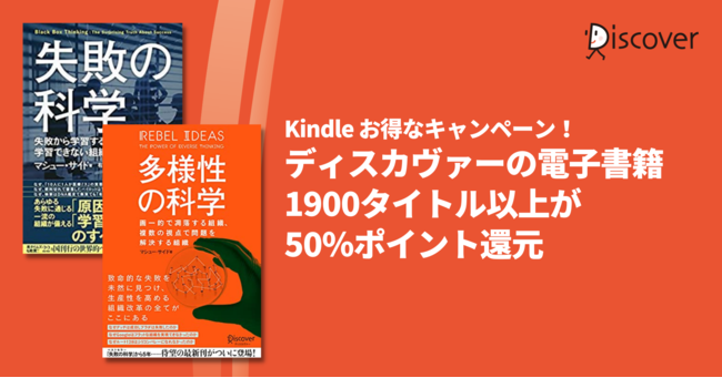 株式会社ディスカヴァー・トゥエンティワン(本社:東京都千代田区、取締役社長:谷口奈緒美)は2022年12月2日から12月15日まで、Kindleにて、ディスカヴァーの電子書籍1900点以上につき、50%ポイントバックキャンペーンを開催します。