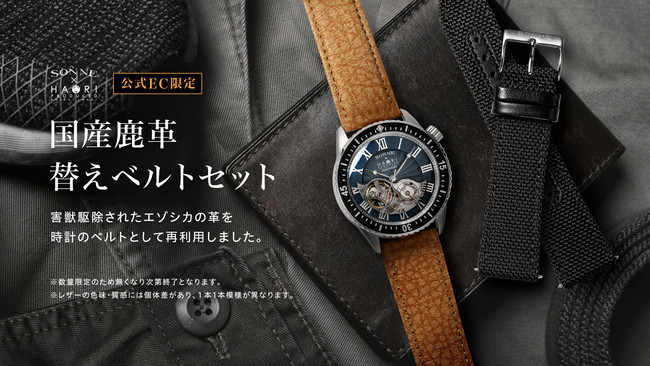 腕時計・ファッション商社の株式会社ウエニ貿易(本社:東京都台東区、代表取締役社長:宮上光喜)は、『SONNE×HAORI PRODUCED(ゾンネ・ハオリプロデュースド)』から、機械式時計に「サステナブル」な「鹿革ベルト」を付属したセットを、4月28日(木)に公式ECサイトで限定発売します。