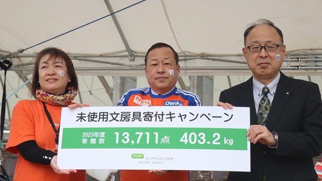 ※3月30日(土)柏レイソル戦でのカナールステージ「ミヨッテ」powered by NCVで、2023年に寄付をいただいた「未使用の文具」寄贈式を実施しました。田上町 鈴木和弘副町長にご同席をいただき、生活協同組合コープデリにいがた 菊地正文副理事長より、新潟県フードバンク連絡協議会 山下浩子会長に寄贈いただきました。