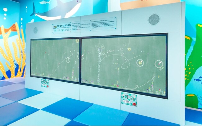 チームラボ、茨城県大洗町のめんたいパーク大洗のキッズランドに、タッチしたり線を引くとインタラクティブに世界が変化する《こびとが住まう黒板》を常設展示。2023年12月7日(木)からは、めんたいパークのキャラクター、タラコン博士とタラピヨが登場します。