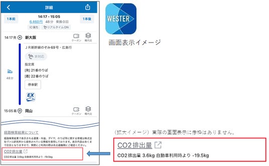 JR西日本公式の移動生活ナビアプリ「WESTER」での経路検索結果に、CO2排出量※2および鉄道利用時と自動車利用時の比較が表示されるようになりました。(2024年6月5日以降順次)