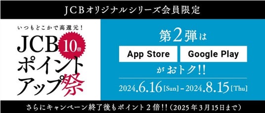 株式会社ジェーシービー (本社:東京都港区、代表取締役兼執行役員社長:二重 孝好、以下:JCB)は、「JCBオリジナルシリーズ」限定の優待店を対象としたポイント高倍率キャンペーン「JCBポイントアップ祭」を開催中です。お客様により楽しく、おトクにお買い物いただけるよう2ヵ月ごとに様々な業種で実施しています。