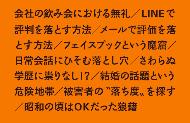 「きれいになったね」「赤ちゃんはまだ?」「独身は自由でいいよね」「食べていけるの?」「おい、生中(なまちゅう)」。家庭や職場や仲間うちで何気なく言ってしまうマナー違反の言葉の数々。自分では気をつけているつもりでも、つい口にしてしまう“失礼な一言”がもたらす行き違いを回避するにはどうすればいいのか。日常会話からメールやLINEのやりとり、SNSへの投稿まで、様々な局面で知っておきたい言葉のレッドライン。