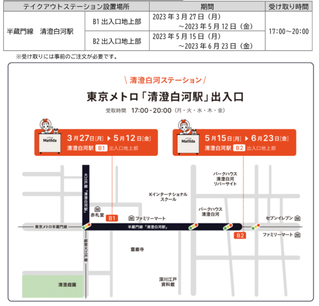 東京地下鉄株式会社(本社:東京都台東区、代表取締役社長:山村 明義、以下「東京メトロ」)、株式会社マチルダ(本社:東京都港区、代表取締役:丸山 由佳、以下「マチルダ」)は、2023年3月27日(月)から、半蔵門線清澄白河駅の出入口地上部に、期間限定で家庭料理のテイクアウトステーションを設置します。