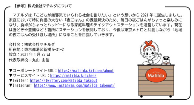 マチルダは、「毎日の夜ごはんがちょっと楽しみになる」家庭料理のテイクアウトサービスです。 日替わりの家庭料理の受け渡しステーションを都内近辺に展開しており、東京メトロのオープンイノベーションプログラム「Tokyo Metro ACCELERATOR 2021」において最終審査を通過した企業です。これまで東京メトロはマチルダとともに、東京メトロ沿線にお住まいの方や東京メトロをご利用のお客様への新たな価値として、東京メトロ沿線で日替わりの家庭料理を受け取ることができるテイクアウトステーションの設置について検討してきました。