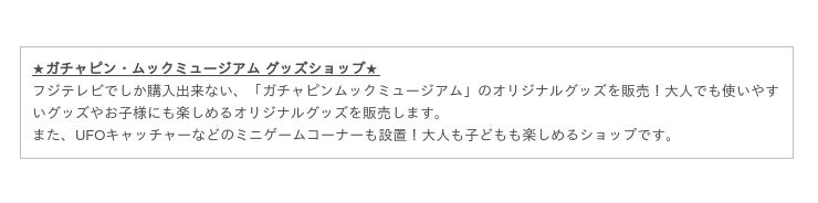 ■入場料金:【ガチャピン・ムックミュージアム 入場チケット】一般(高校生以上)…400円