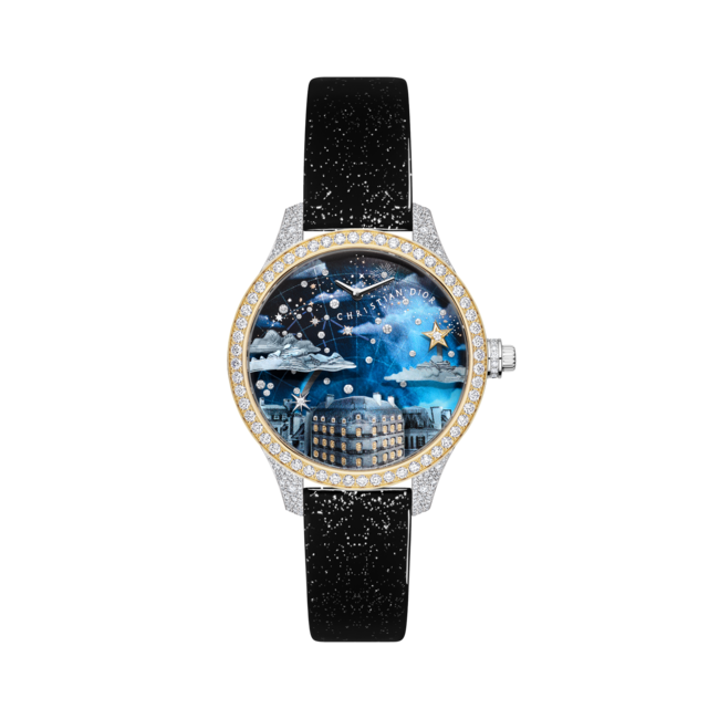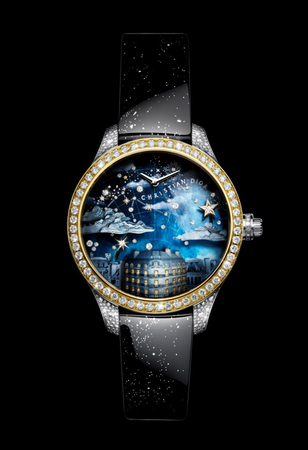 エングレーブとプリントを施したマザーオブパール製の雲 、ゴールドとシルバー製の星にブリリアントカットのダイヤモンドをセット、 スーパールミノバとダイヤモンドで描かれた水瓶座の星座、オープンワークとプリントを施したマザーオブパール製の30モンテーニュ本店、 Brass (真鍮)製の窓