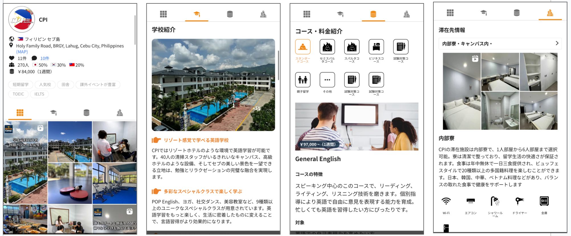 ネイティブキャンプ留学では、ユーザーが必要な情報を分かりやすく把握できるよう、常に丁寧で明確な情報提供を心がけています。CPIの詳細情報は、以下の4つのカテゴリーに分けて掲載しており、知りたい情報を的確にお届けします。