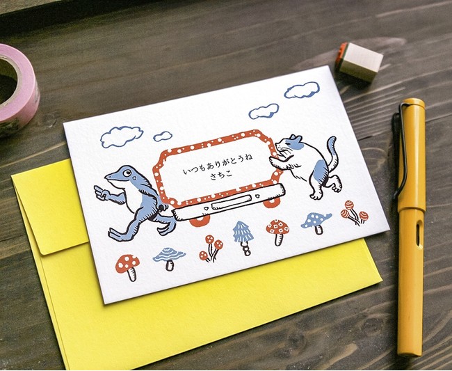 ネコとカエルがパネルを持っているイラスト入りカードにご希望のメッセージを 活版印刷で仕上げます。