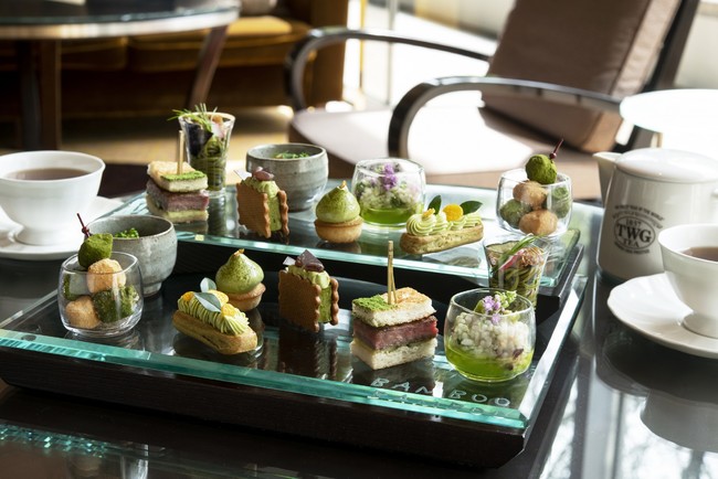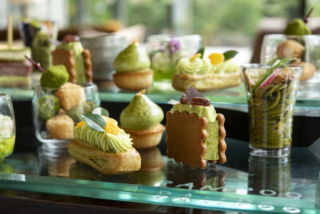 和素材を洋風にアレンジした抹茶アフタヌーンティーをはじめ、あんみつをモチーフに仕立てた抹茶黒蜜パルフェ、お客様の目の前で仕上げる抹茶モンブランなど、新茶と新緑の季節におすすめしたい抹茶づくしのメニューをご用意します。