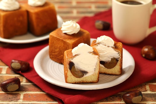 こだわり:キューブ型が目をひく新商品。菓子パン生地に渋皮栗とこしあんを包んで焼き上げました。