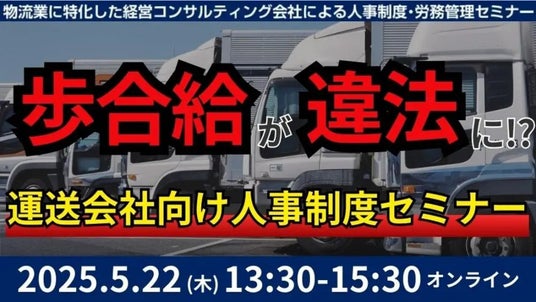 日本最大級の物流コンサルティングファーム 船井総研ロジ株式会社(本社:大阪市中央区、代表:橋本直行、以下「船井総研ロジ」)は、2025年5月22日(木)13:30~15:30、 運送会社の経営者・経営幹部の方々を対象にした「第3回 未払賃金訴訟と乗務員の連鎖離職を回避する賃金制度構築セミナー2025」をオンラインで開催いたします。