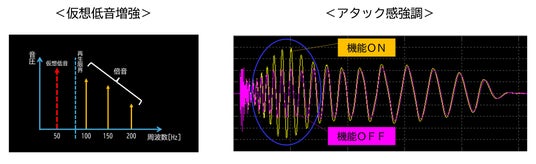 倍音成分を適切に付加することで、スピーカーの再生帯域より低い周波数の低音を体感することができます。