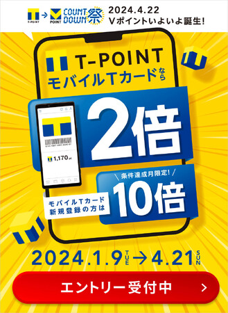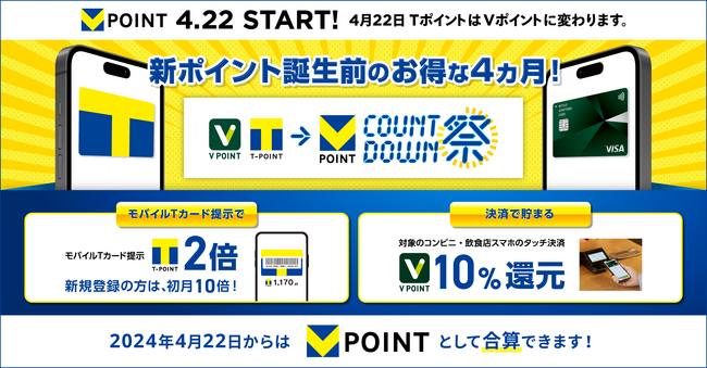 CCCMKホールディングス株式会社(本社:東京都渋谷区、代表取締役社長 兼 CEO:高橋 誉則、以下「CCCMKHD」)と三井住友カード株式会社(本社:東京都江東区、代表取締役社長:大西 幸彦、以下「SMCC」)は、CCCMKHDが提供する「Tポイント」とSMBCグループが提供する「Vポイント」が、2024年4月22日(月)に「青と黄色の『Vポイント』」へ統合することに先駆け、2024年1月9日(火)から4月21日(日)まで、「Tポイント」と「Vポイント」がお得に貯まる合同キャンペーン「カウントダウン祭」(https://tsite.jp/fes1)を開催いたします。