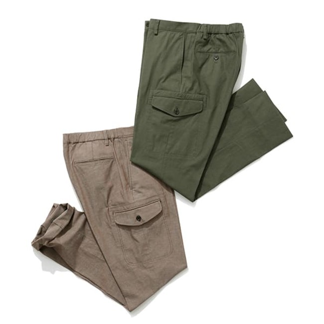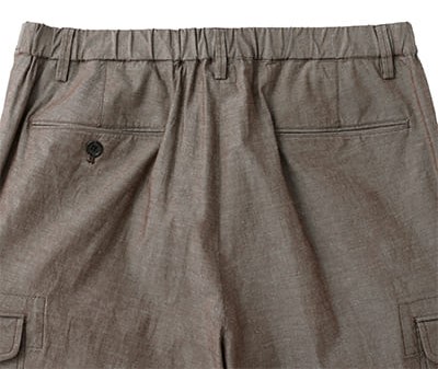 コットンに麻をブレンドすることで、清涼感と耐久性に優れたアイテムに仕上げました。 表面のシャンブレー生地が深い色味と上品な光沢感をプラスし、トレンドのミリタリースタイルを演出できる大人のカーゴパンツです。