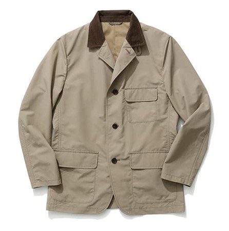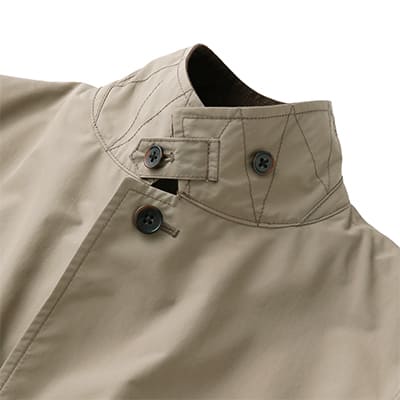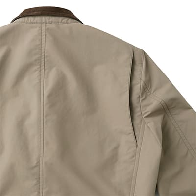 ポリエステル素材を使用し、軽やかな着心地で春先から活躍するアイテムです。コットンライクなタイプライター生地に撥水加工を施しており、トラッドな印象のサマーコーデュロイの襟がポイントです。