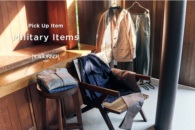 軍服のデザインやディテールを取り入れた洋服のことを総称して「ミリタリー」と表現しますが、そのバリエーションは様々です。 現代では、ミリタリーアイテムのもつ高い機能性と無骨なデザインがメンズファッションにおいて欠かせない魅力となっています。NEWYORKERでは歴史あるミリタリーアイテムにフォーカスを当て、モダンなデザインや機能性を備えたアイテムを展開します。