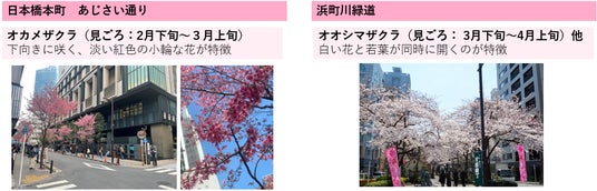 日本橋周辺には桜が美しいスポットが多数あります。桜の咲くシーズンには周辺の桜見どころスポットを巡って日本橋を満喫するのもおすすめです。中でも、商業施設「COREDO室町2」の東側にある静かな裏通り「あじさい通り」は一足先にお花見ができる「穴場」スポットで、通常2月下旬から3月上旬にかけて淡い紅色をした早咲きのオカメザクラが開花します。