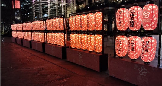 江戸時代から、商業の中心地であった日本橋の賑わいを演出していたちょうちん。大屋根広場では、今年も街を彩る約70張の桜色のちょうちんが登場。