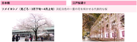 昨年大好評だった屋外カフェで、見た目も楽しい華やかなパフェを楽しめる「日本橋パフェス」や、日本橋の伝統の味や限定メニューが気軽に楽しめる「ニホンバシ桜屋台」、“春”をモチーフにしたこの春限定のメニュー「桜メニュー&グッズ」など、桜満開の日本橋で楽しむことができます。