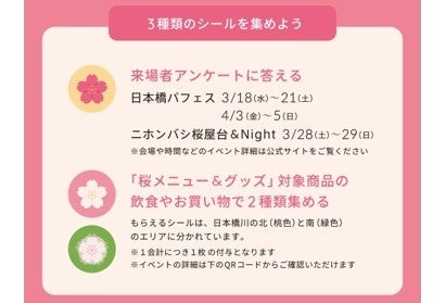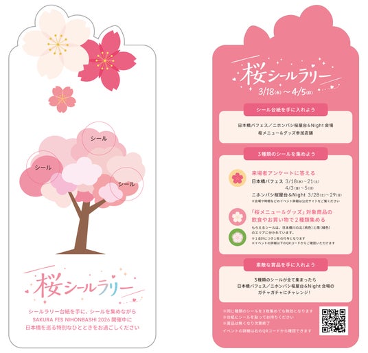 「桜メニュー&グッズ」の対象2エリア(緑色シールエリア/桃色シールエリア)でお買い物をされた方、またはイベント会場(「日本橋パフェス」「ニホンバシ桜屋台」「ニホンバシ桜屋台Night」のいずれか)にご来場いただいた方に、それぞれ桜シールをお渡しします。3種類のシールを集めると、ラリー台紙と引き換えにガチャガチャ抽選会にご参加でき、抽選で素敵な賞品が当たります。お買い物やイベントを楽しみながら、春の日本橋を巡ることができる企画です。※なくなり次第終了