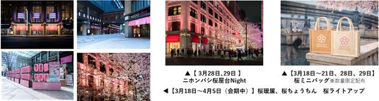 イベント期間中は、日本橋の街を桜色に染める春の風物詩「桜暖簾」が街を彩り、夜には、さらにパワーアップしエリアを拡大した「桜ライトアップ」や、夜桜を眺めながら楽しめる「桜屋台Night」も開催。また、今年も各イベント会場では数量限定のオリジナルバッグを配布するなど、桜色に染まる日本橋を存分に楽しめるコンテンツが盛りだくさんです。