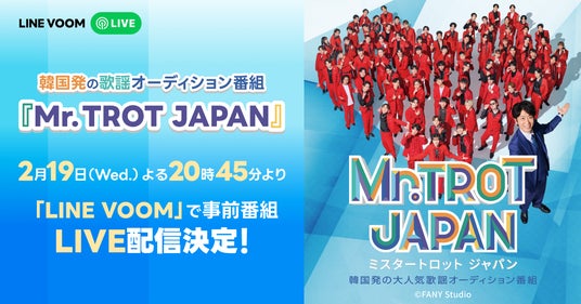 LINEヤフー株式会社は、「LINE」内のショート動画プラットフォーム「LINE VOOM」にて、2025年2月19日(水)20:45より、韓国で人気のオーディション番組『明日はミスター・トロット』の日本版、『ミスタートロット ジャパン』の開始を記念した特別番組『みんなで観よう!ミスタートロットジャパン』を配信します。