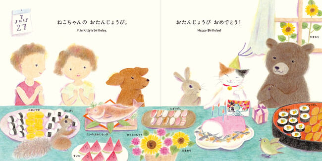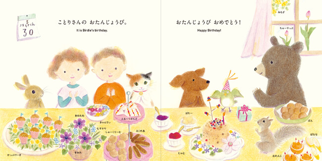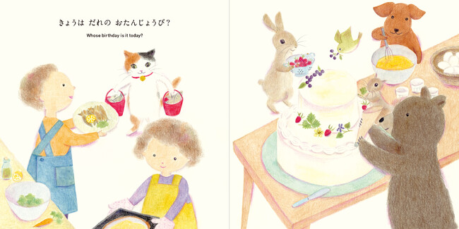 今日はだれのお誕生日だろう?とわくわくしながらページをめくっていくと、賑やかな笑い声が聞こえてきそう。テーブルに並ぶおいしそうなお皿たち(窓の外も!)や細かなディテールも眺めてうれしいとっておきの一作です。