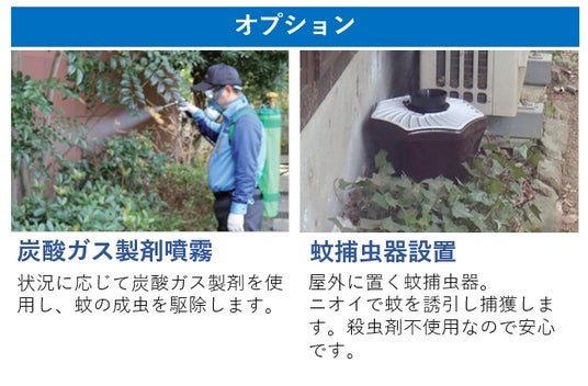 茂みなどの環境や蚊の発生状況に応じて、新サービス『蚊駆除 点検・予防サービス』とともにご利用いただけるオプションサービスもご用意しています。茂みなど立ち入りの難しい場所には液化炭酸ガス製剤を使用し、すみずみまで噴霧します。また、外部から飛来した蚊も効果的に捕獲したい方には蚊捕虫器の設置を行います。