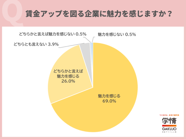 賃金を上げる企業について、「魅力を感じる」と回答した20代が69.0%に上りました。「どちらかと言えば魅力を感じる」26.0%を合わせると、「賃金を上げる企業」に魅力を感じている20代は95.0%に達します。「従業員を大切にしていると感じる」「全ての企業が賃上げに踏み切れるわけではないので、魅力を感じる」「物価高で企業の支出も増えているはずなので、賃金を上げることができるのは、成長性の表れだと思う」「賃金を上げる企業は、優秀な働き手からも選ばれやすくなるので、今後も成長を続けていくと感じる」といった声が寄せられました。賃金アップは、業績の好調さや成長性の表れだと受け止める20代が多いことが推察されます。