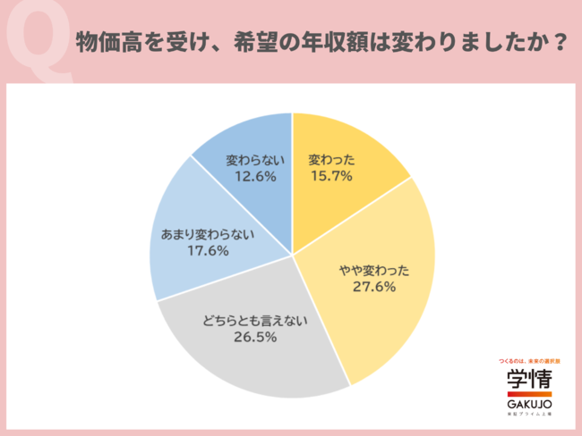 株式会社学情(本社:東京都千代田区)は、20代の仕事観や働く意識をひも解くために、アンケート調査を実施しました。今回は、「物価高への対応」に関して調査。「物価高を受け、希望の年収額が変わった」と回答した20代が43.3%に上りました。「変わらない」の回答(30.2%)を、13.1ポイント上回っています。「物の値段が上がっているので、年収が上がらないと生活レベルを下げることになる」「特に20代のうちは自己投資が必要だと思う。自身の成長のために使えるお金を確保するためにも年収を上げたい」といった声が上がりました。また95.0%の20代が、「賃金を上げる企業は魅力を感じる」と回答。「賃金を上げることができるのは、成長性の表れだと思う」「賃金を上げる企業は、優秀な働き手からも選ばれやすくなるので、今後も成長を続けていくと感じる」など、賃金アップは企業の成長性の表れだとする声が寄せられています。