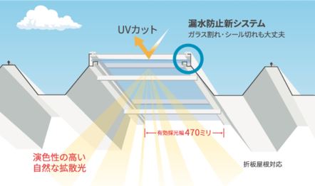日中はスリット形状の天窓が、建物内全体に自然な拡散光を導入。 照明器具なしで必要な明るさを確保し、省エネを実現します。 また、天窓からの雨漏りを防ぐ「漏水防止新システム」を搭載しています。