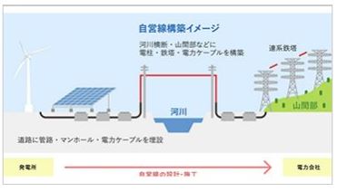 自営線とは、太陽光をはじめとした再生可能エネルギーの発電所から電力連系点までを結ぶ送電ルートです。