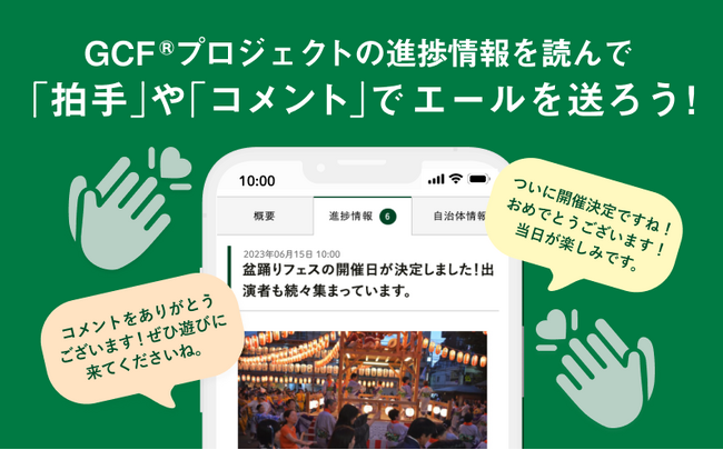 今回新たに追加される「拍手・コメント」機能は、ふるさとチョイスの利用者が自治体やその地域に対して継続的に関心を持ち、地域のファンになるきっかけを創出するためにリリースされます。具体的な機能としては、各自治体により書かれたGCFプロジェクトの進捗状況を伝える「進捗情報」のページに、ふるさとチョイスの利用者が「拍手」や「コメント」をできるようになります。「拍手」機能は、ふるさとチョイスの未会員や未寄付者でも利用可能で気軽にプロジェクトに対する気持ちを伝えられるためより多くの応援者を募ることができます。「コメント」機能は、プロジェクトへの寄付をした方が利用可能で、プロジェクトに関わる人たちに応援の気持ちや想いをコメントで伝えることができるだけでなく、プロジェクトに関わる自治体職員や運営者からコメントバックができるため、双方向のコミュニケーションが可能になり、地域の課題解決や挑戦の後押しに繋がります。