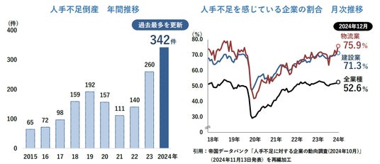 人手不足によって事業継続の断念に追い込まれるケースは、一層深刻化してきた。2024年に従業員の退職や採用難、人件費高騰などを原因とする人手不足倒産は、累計で342件が発生。年間ベースとして、調査を開始した2013年以降の過去最多を、2年連続で大幅に更新した。
