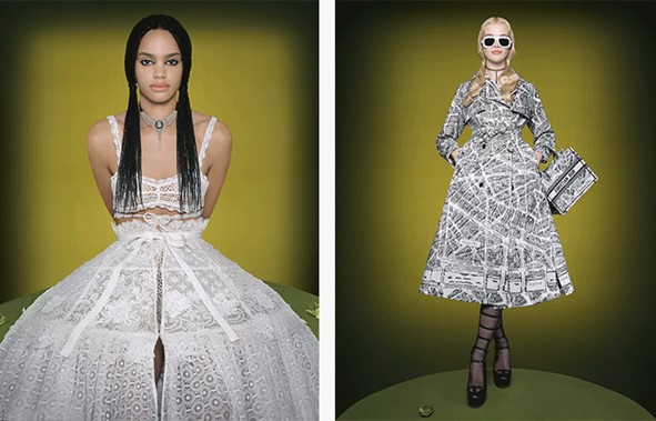2023年春夏 コレクションにおいて、クリエイティブ ディレクターのマリア・グラツィア・キウリは、カトリーヌ・ド・メディシスからインスピレーションを受け、権力者としての気品に満ちたワードローブを通じて、女性の力の多面性を探求しました。写真家、ブリジット・ニーデルマイルによって撮り下ろされた一連の作品を通じて、ディオールスタイルのルネサンスに命が吹き込まれ、神秘に彩られた世界観が浮かび上がります。光と影の間、グリーンの陰影が照らし出す洗練された空間で写し出されたルックは、ディオールの本質と、グラフィカルなフォルムによって強調され、生まれ変わったコルセットなどのスタイルアイコンとの象徴的な出会いを物語ります。クリノリンスカートとドレスは、過去と現在の対話によって再解釈されたスポーツウェアのディテールとともに、これまでにない調和で再解釈されています。このコレクションに宿る神秘に満ちた魅惑的な旅は、永久的な女性の強さやはかなさ、美しさを讃えます。