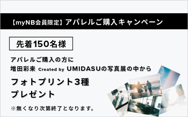 アパレル1点以上ご購入で、写真家増田彩来 Created by UMIDASUがニューバランステラスモール湘南のために撮り下ろした写真の中からランダムでフォトプリント(1セット3枚)を先着150名様にプレゼントいたします。
