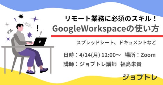 ワークキャリア株式会社(所在地:東京都港区、代表取締役:秋吉 正樹)は在宅勤務の可能性を広げるスキル獲得の第一歩というテーマで 4/14(月)12:00~ 参加費無料のGoogle Workspaceの使い方を学ぶセミナーを開催します。