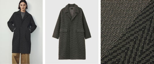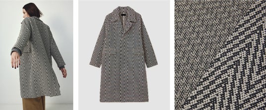 印象的なヘリンボーン柄のニットツイードコートは「ノイズ(= 音)」の美しさを、丁寧に編み立てたニットの編み地で表現した、ROPE の別注パターン。