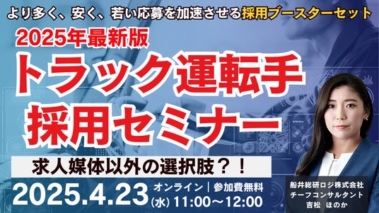 日本最大級の物流コンサルティングファーム 船井総研ロジ株式会社(本社:東京都中央区、代表:橋本直行、以下「船井総研ロジ」)は、2025年4月23日(水)11:00~12:00、 運送会社の経営者・経営幹部の方々を対象にした「2025年最新版 トラック運転手採用セミナー」をオンラインで開催いたします。