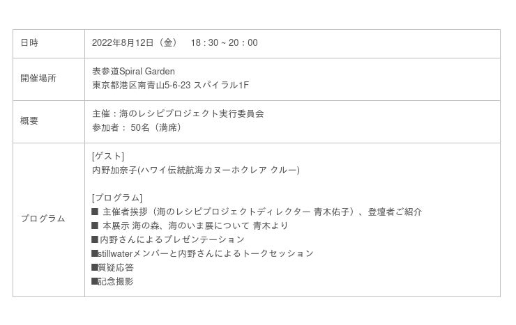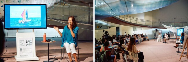 「食」と「ものがたり」を通して海を伝えるウェブメディア「海のレシピプロジェクト」を運営する海のレシピプロジェクト実行委員会は、表参道スパイラルガーデン(スパイラル1F)にて開催された『海の森、海のいま展 ー海のレシピプロジェクトと新たな航海のはじまりー』にて、最終日の8月12日(金)、ハワイ伝統航海カヌー「ホクレア」クルーの内野加奈子さんをお迎えし、『海の時間と私たちの時間─ハワイの伝統航海カヌー「ホクレア」の旅から─』と題したトークイベントを開催しました。