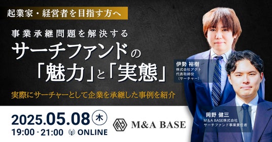 M&A BASE株式会社(所在地:東京都港区、代表取締役:小島 直広)は事業承継問題を解決するサーチファンドの「魅力」と「実態」をテーマに、5月8日(木)19:00~ 参加費無料のウェビナーを開催します。