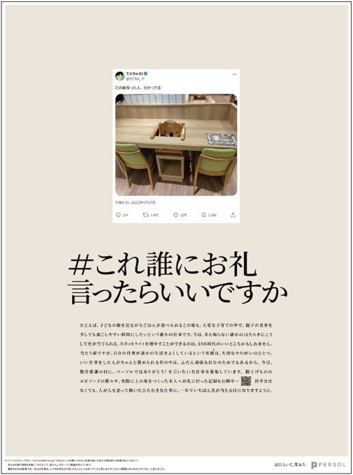 「#これ誰にお礼言ったらいいですか」は、はたらく人々に感謝する勤労感謝の日に、世の中にあふれるいつかの名前も知らない誰かの仕事に対する行き場のない感謝を集め、讃え、届けることで、“はたらくWell-being”の実感向上につなげることを新たな文化とする取り組みです。X(旧Twitter)上にて「#これ誰にお礼言ったらいいですか」のハッシュタグのもと、世の中にあふれる誰かの仕事に対する行き場のない感謝を皆さまから集め、その仕事を讃え、届けます。勤労感謝の日の当日には、日本経済新聞朝刊に本プロジェクトの開始を宣言する新聞広告を掲出。さらに、集められた感謝を実際に本人まで届ける「お礼代行」アクションを実施。感謝を実際に本人まで届ける様子をnote(https://note.com/persol_group/n/nbc8182732392)にて公開しています。