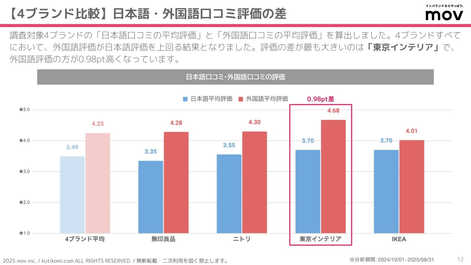 こちらのグラフでは、調査対象4ブランドの「日本語口コミの平均評価」と「外国語口コミの平均評価」を算出しています。4ブランドすべてにおいて、外国語評価が日本語評価を上回る結果となりました。評価の差が最も大きいのは「東京インテリア」で、外国語評価の方が0.98pt高くなっています。